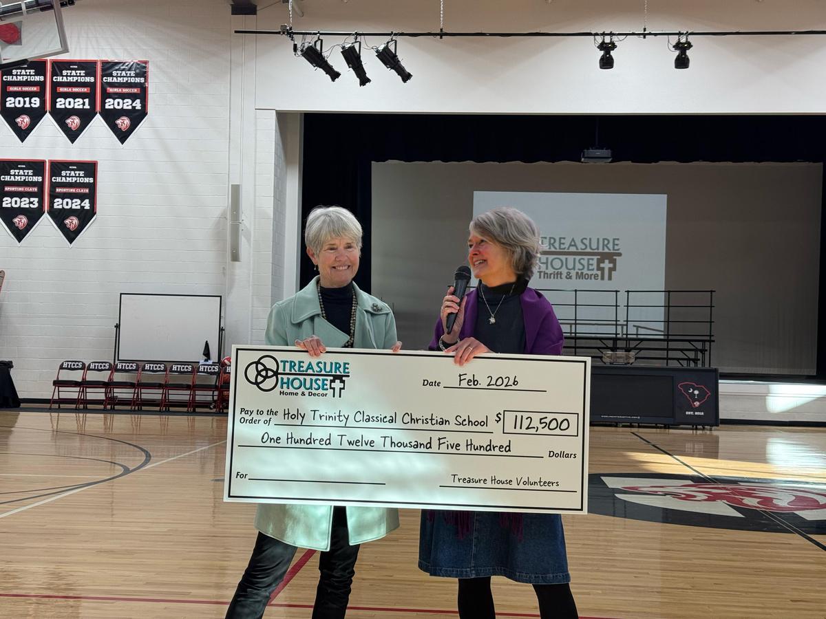 BEAUFORT, S.C. - Holy Trinity Classical Christian School announced this week that the Treasure House Thrift & More, a mission-driven organization which is an outreach of St. Helena’s Anglican, presented a check to the school in the amount of $112,500 on Friday, February 6th during K-12 Chapel. Treasure House commits 50% of their net profit to HTCCS each year. This remarkable gift was made possible by generous donations of items to the store, as well as a wonderful group of St. Helena’s volunteers, who are led by store manager, Jill Rubin.